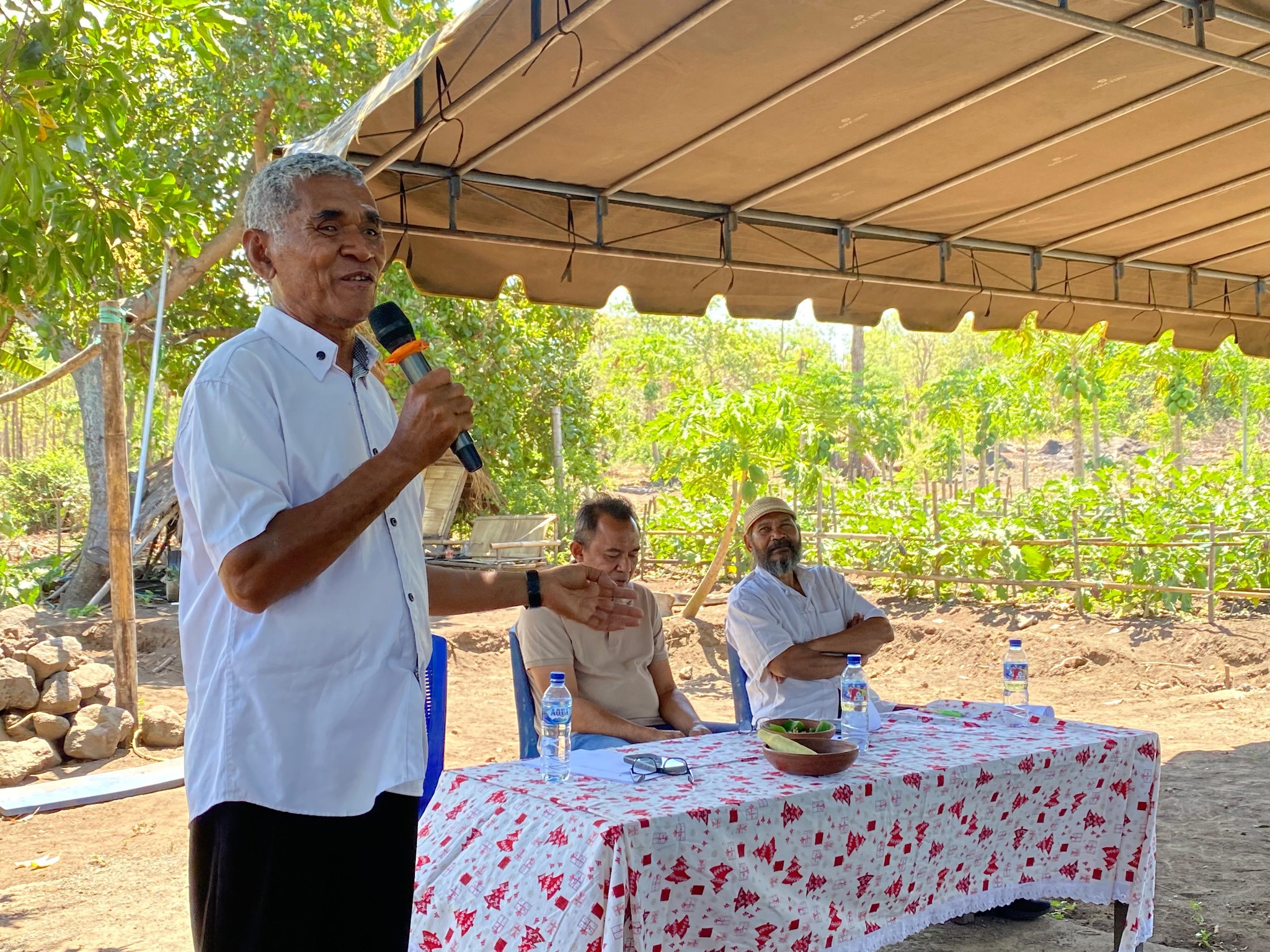 Lokakarya bertajuk “Membedah Peta Jalan Pertanian Flores Timur” juga sukses diselenggarakan pada Sabtu, 13 September 2025 di Ladang Bayolewun dengan dukungan sponsor dari Bank Pembangunan Daerah (BPD) NTT. Kegiatan ini menghadirkan Bupati Flores Timur, Ir. Antonius Doni Dihen, sebagai keynote speaker yang menekankan pentingnya sinergi lintas sektor dalam mewujudkan kedaulatan pangan di Flores Timur. Turut hadir Kepala Dinas Ketahanan Pangan, empat camat (Kelubagolit, Adonara Timur, Ileboleng, dan Witihama), para kepala desa beserta aparat, kelompok tani, serta para pendamping desa. Lokakarya ini semakin bernilai dengan kehadiran praktisi pertanian dan Pahlawan Pangan Nasional, Bapak Kamilus Tupen, yang berbagi pengalaman praktik cerdas Bank Waktu dalam mendukung sistem pertanian berkelanjutan. Kehadiran beragam pemangku kepentingan dalam lokakarya ini memperkuat komitmen bersama untuk menata ulang peta jalan pertanian Flores Timur, dengan tujuan mendorong produktivitas, meningkatkan kesejahteraan petani, serta memastikan tercapainya kedaulatan pangan daerah.